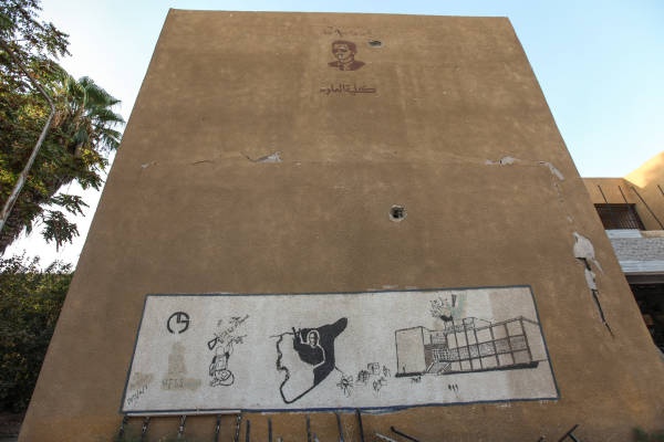 Desks and chairs were gathered in one place near the entrance to collect dust and the boards have names of ISIS properties on them. ISIS flags were drawn on the walls of the university building. There are some murals on the entrance wall of the university. In one of the murals, a dark human silhouette is looming over the map of Syria. In another, a boy with a backpack is depicted painting weapons. The dark side of ISIS is also painted on the walls and a significant detail is that pictures of Bashar Assad who claims to fight ISIS also appear on the walls.